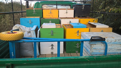 Φορτωμένο το φορτηγό με άδειες κυψέλες και πατώματα που θα χρησιμεύσουν για να μπουν τα τρυγημένα πλαίσια που θα έρθουν στο μελισσοκομικό εργαστήριο αλλά και τα άδεια από μέλια πλαίσια που θα μείνουν στα μελισσοκομεία (κλεισμένα καλά για να μην μπαίνουν ούτε σε αυτά οι μέλισσες). Γιατί αφήνεις κυψέλες και πατώματα με άδεια πλαίσια στα μελισσοκομεία σου θα πείτε. Γιατί κάποιες κυψέλες θα δώσουν πάνω από 10 πλαίσια με μέλι και χρειάζεσαι άδεια πλαίσια για να συμπληρώσεις την κυψέλη με 10 πλαίσια (όλα τα μελίσσια θα κατέβουν ως δεκάρια στο δεύτερο χέρι όσο και εάν είναι το μέγεθος τους, έχουν περάσει ήδη μια περίοδο στα πεύκα στην καλύτερη περίπτωση να κατέβουν ως δυνατά δεκάρια αλλά μέχρι εκεί, δεν έχει νόημα να τα βάλεις τζάμπα και βερεσέ πάλι ορόφους), αλλά υπάρχουν και μονά μελίσσια που εκεί θα πρέπει να προσθέσεις και πλαίσια μια που θα τα αφήσεις στάνταρ με λιγότερα από 10 πλαίσια με τον τρύγο. Που τα βρίσκεις τα άδεια πλαίσια? Σε διπλές κυψέλες που θα δώσουν λιγότερα από 10 πλαίσια μέλι και θα κατεβάσεις τους ορόφους τους.